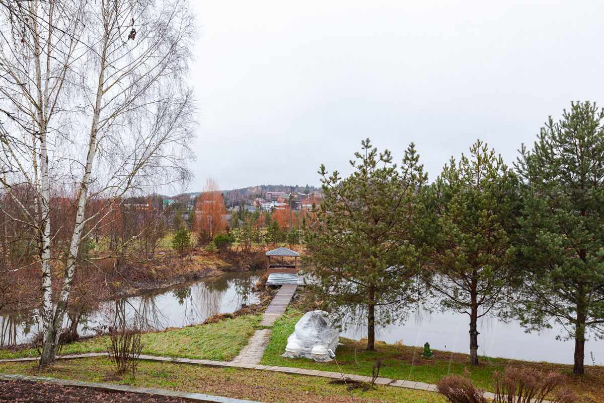 Дома недалеко от озера и окружены зеленью.